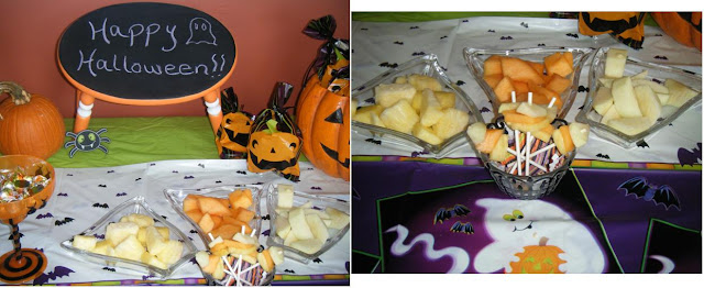 Below you will see our fruit display as well. We attempted to make our own 'candy corn' fruit skewers using pineapple, cantalope, and apple triangles. The Kids could use short lollipop sticks and make their own 'candy corn'. Simple, fun and healthy too!